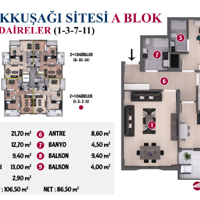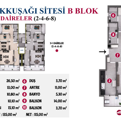 Proje 8 adet 3+1 ve 14 adet 2+1 olmak üzere toplamda 22 daireden oluşmaktadır.